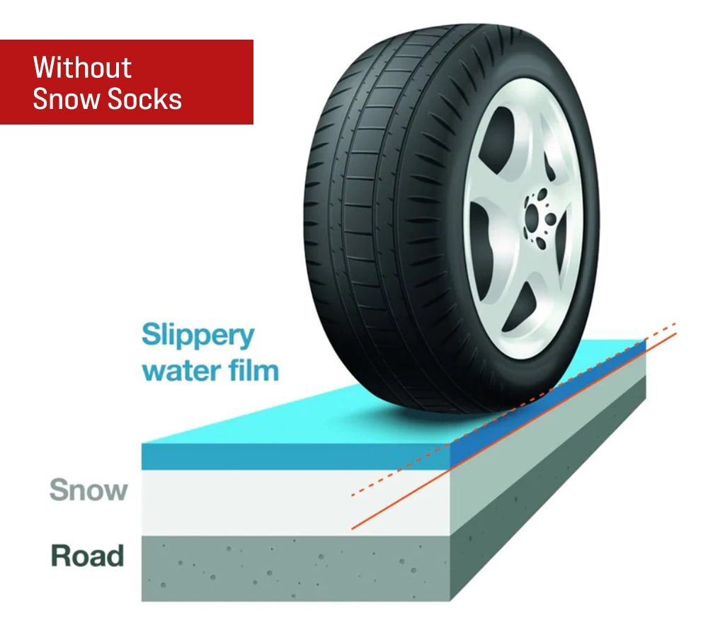 - Enhanced Traction: Fabrics typically adhere to dry snow and ice. The organized fibers incorporated into the road contact fabric of snow tire socks enable the material to absorb and expel water from the area between the ground and the tire, thereby optimizing the grip through dry friction.