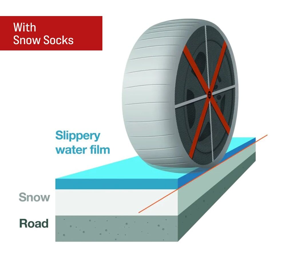 - Front Fabric: The woven and coated netting stabilizes the complete snow socks, preventing snow accumulation or debris between the tire and the road-contact fabric.