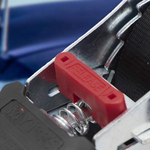 | This ratchet strap is bolted on through a hole past the windlass meaning there isn't a fixed end with a strap on it. Instead, it features a metal rod in the instance you don't have something to latch the S-hook onto, you can latch it right back onto the ratchet! | By simply pressing down on the release point, you are able to let the strap auto-retract into its housing, or you can pull out the amount of strap you need to secure your load! | Like all of Mytee's straps, this one is made with reinforced polyester webbing that keeps the strap lightweight while also being incredibly strong for its size! |