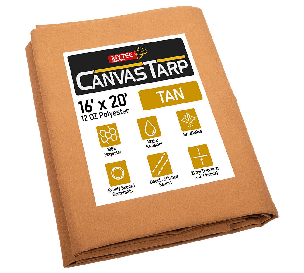 - Heavy Duty water resistant 16' x 20' (finished size) Canvas Tarps from Mytee Products are made with 12 Oz Polyester Material.