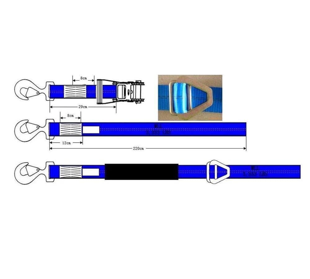 Securely tie down your vehicle using our Ratchet Axle Straps. The strap features an adjustable D-Ring that can be moved to the appropriate location on the straps for proper tie-down. Use this strap along with our axle straps in order to securely tie-down your vehicle.