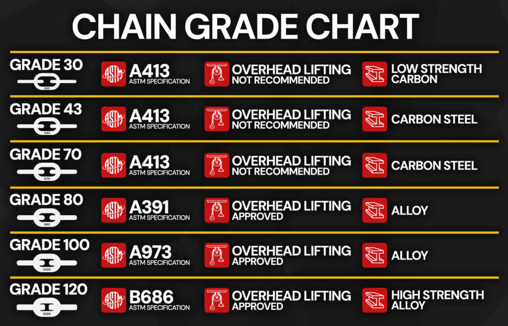 This equation works for nearly every chain on the chain chart until you get to chains that are designed with different materials. Carbon steel chains, like Grade 30, 43, and 70, cannot handle the stress/Newtons required for tasks such as overhead lifting. Meanwhile, alloy steel chains – like Grade 80 and higher – can handle that kind of tensile force and thus are recommended for any heavy-duty lifting.