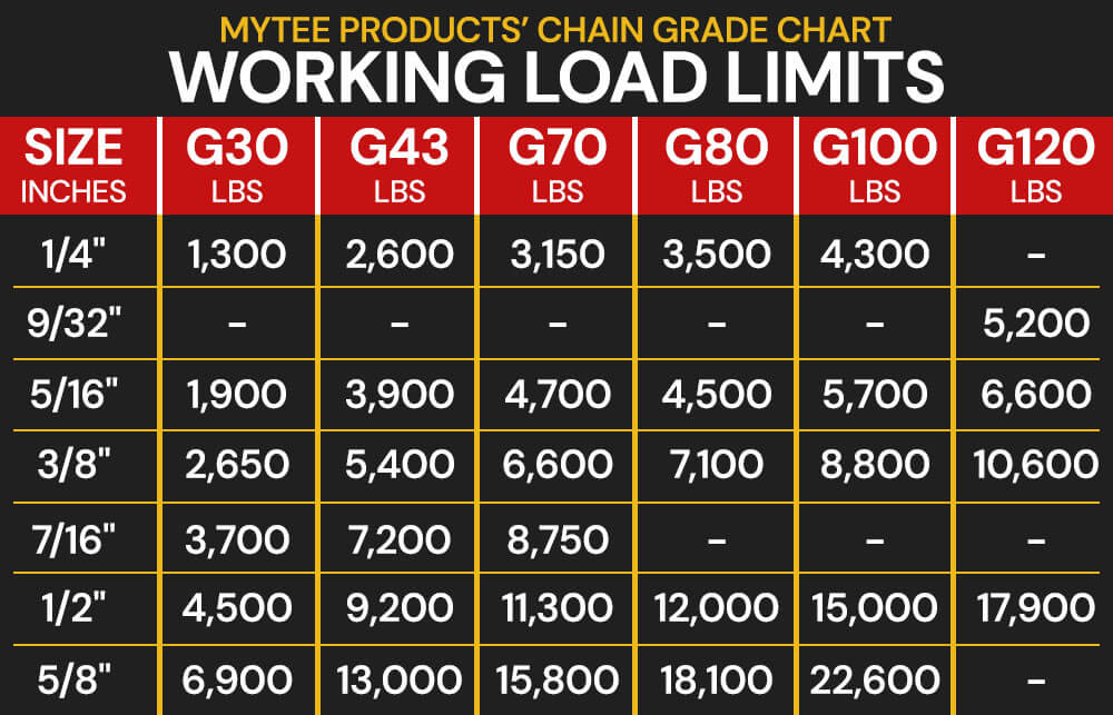 Other safety measures that were put into place when identifying which chains are appropriate and safe for overhead lifting was determining the working load limit of each chain grade. The working load limit of a chain differs depending on the size of the links, as seen in the chain number chart above. It’s integral that you know the total weight of the cargo you plan to haul or lift before you purchase any chain rating.