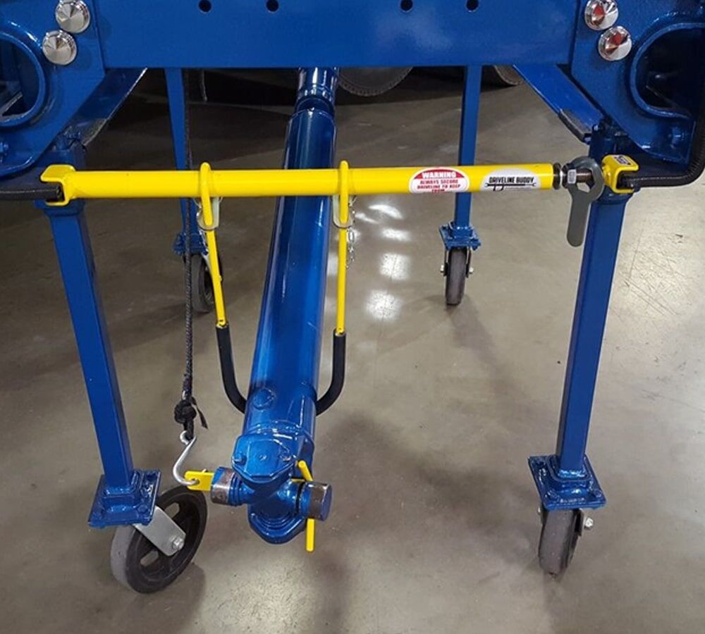 - Driveline Buddy Includes: Suspender Bar w/ Brackets on each end, Driveline Cradle w/ large "U" shape for driveline, and 2 hook ends. Each has a pre-drilled lock plate w/ attached ock pin lynch pin. The Rope Ratchet and T-Bar.