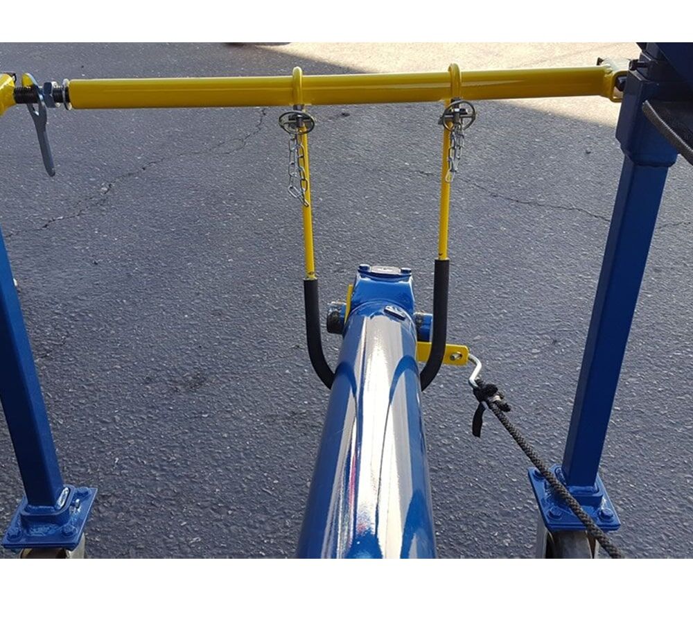 3. Place cradle under driveline and rest both hooks on suspender bar. BEFORE resting driveline in cradle, slide lock-plates onto each hook end and secure with lock pin lynch pin.