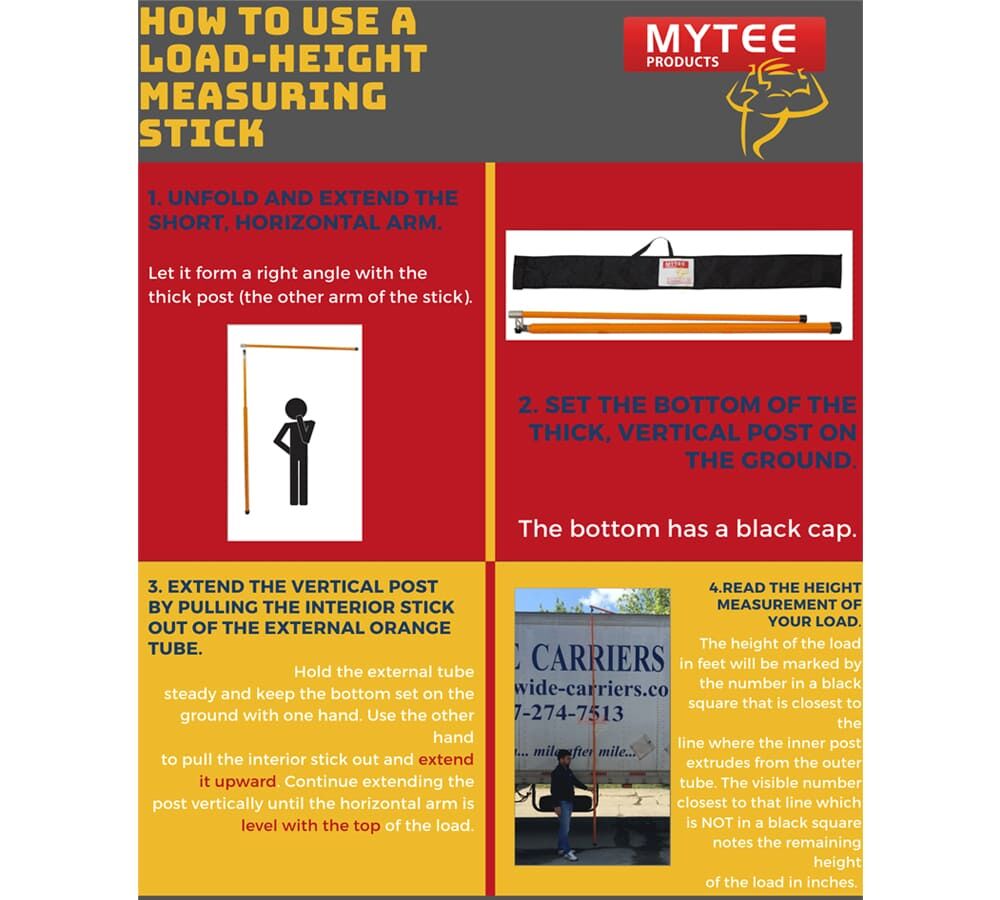 Clearance heights vary in every state across the country. Every day, a truck trailer and its cargo are damaged due to the driver not knowing their load height. With the Load Height Measuring Stick from Mytee Products, you can put that anxiety to rest knowing what your height is.