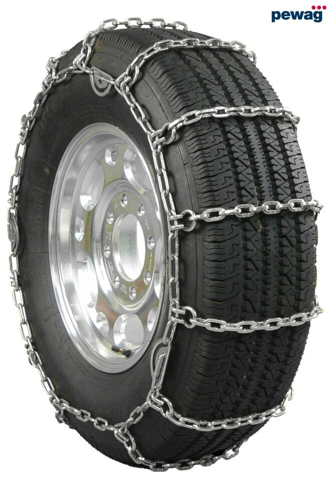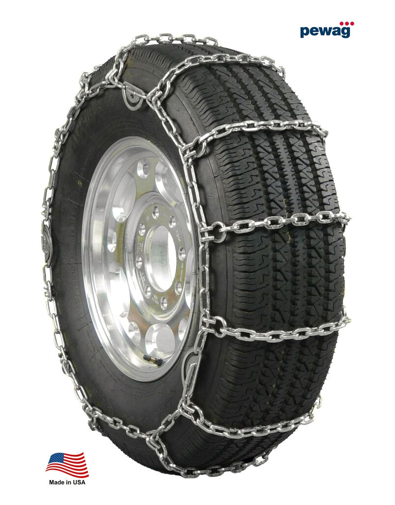pewag nickle manganese alloy square link tire chains wear up o 48 times longer than conventional twist link tire chains while giving you up to 32% more traction. The ladder style chain features both a cam or non-cam side chain for every driver preference.