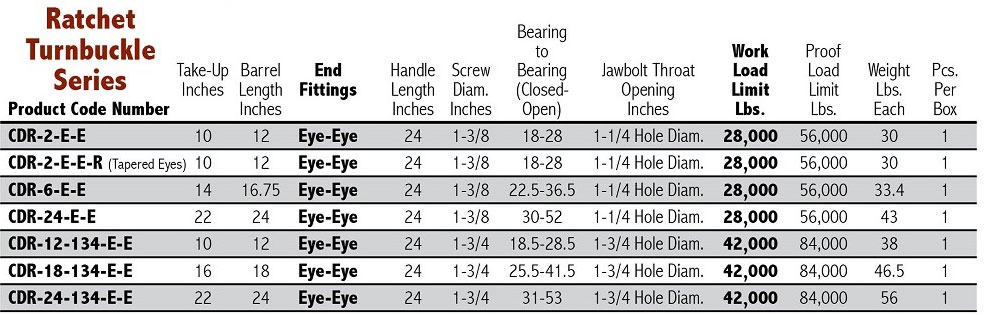 | Turnbuckle Size | 1-3/4" Thread x 24" Barrel, 42K WLL |