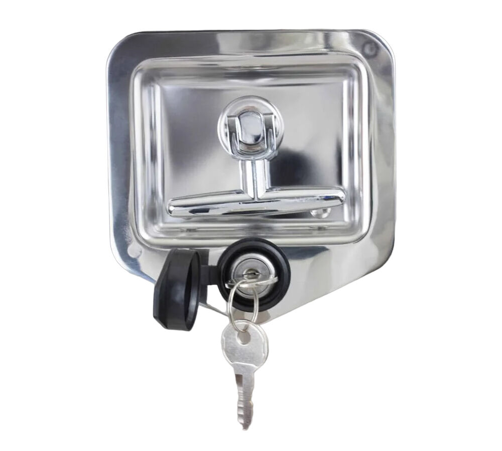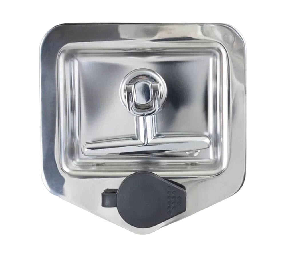 - Equipped with a stainless steel locking T-handle latch Recessed, beveled door with a 1/2" door gasket and stainless steel continuous hinge create a tight waterproof box